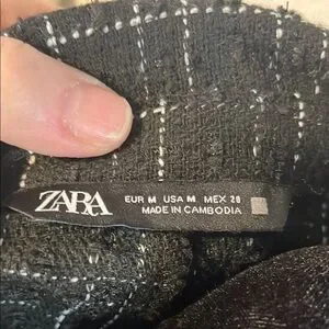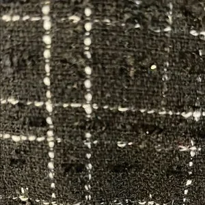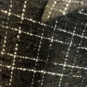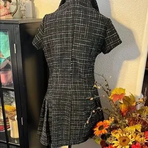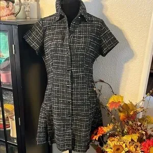 This dress features a sophisticated black and white design with a fitted silhouette, highlighted by a classic polo collar. Its short sleeves and buttoned style make it a versatile addition to any wardrobe. I tried to capture the tiny little crystals that you can see throughout the whole gown. It's weave material super cute. The back has some area that is not stitched. You'd have to hand stitch it. That's why I'm letting it go for cheap. It's about an inch and a half. I'll take a picture of it when I get home.