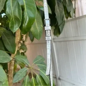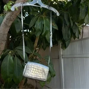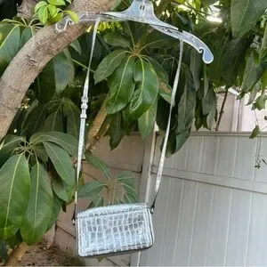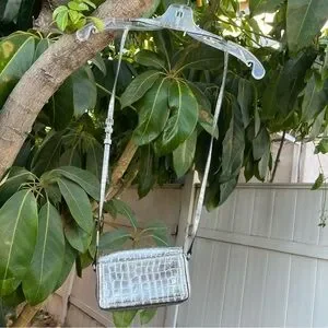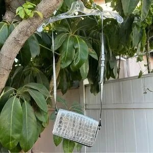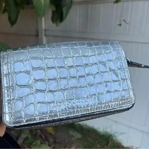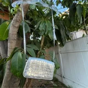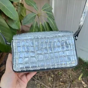 Marc Jacobs Croc Embossed Mini Crossbody Bag In Silver. The bag has a width of 7 inches, a height of 4 inches, and a depth of 2 inches, making it a perfect size for carrying your essentials. The exterior of the bag is made of leather with a metallic finish, and the strap is made of leather with a silver crossbody style. The bag has a magnetic closure, and the lining is made of black fabric. It features a croc pattern and a rectangular shape. This crossbody purse is perfect for any occasion, and its silver exterior and handle/strap material make it a fashionable accessory. Can be styled with so many outfits and style aesthetics. the only flaw is the on the strap there is a little bit of material peeling but it’s not noticeable at all when worn.