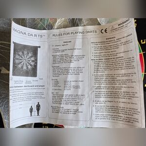 NWT. Never used. Magnetic dartboard made of lightweight/flexible material (feels like the material on a cloth/spandex bicycle seat) featuring a classic design. Includes 3 red and 3 blue magnetic darts, instructions, and box/tube for storage. Hanger attached. Safe for all ages. Offers welcome!