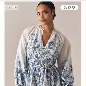 Elegant floral dress in blue and white. Features a delicate lace trim and a flattering fit.