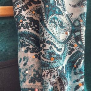 JM Collection Woman new with tags from Macys. Elevate your style with this elegant teal open front cardigan. Featuring a matching (detachable) scarf, necklace combo and roll cuffs with elegant buttons. Attached black faux tank. Ideal for any occasion. Longest length is 33” when hanging.