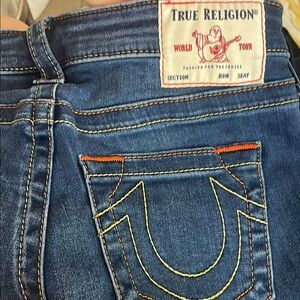 Classic True Religion denim jeans featuring bold orange stitching. Ideal designer jeans for everyday style.