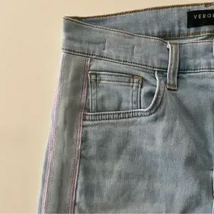A signature style by Veronica Beard, these cropped jeans feature tonal grosgrain tuxedo stripes and an exposed button fly. Belt loops. Five pocket styling. Raw edge hems.