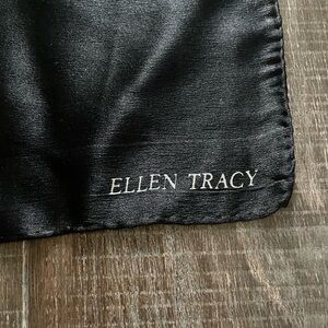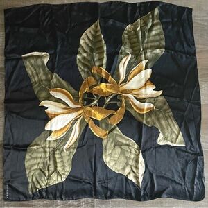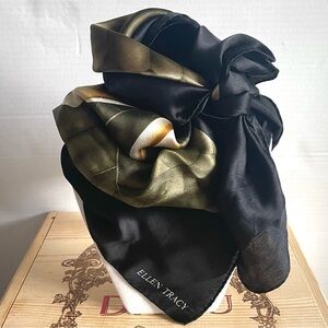 Beautiful vintage Ellen Tracy scarf featuring a striking floral design in warm gold, green, and black tones. Measures 36” x 36” and is made of silk. Has some minor flaws due to age but remains in good overall condition. Perfect for adding a sophisticated touch to any outfit!