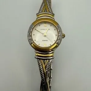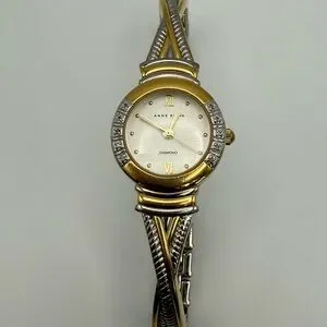 Elegant Anne Klein women's watch featuring a stunning gold and silver design with diamonds around face. . Perfect for adding a touch of luxury to any outfit. About eight inches around.