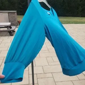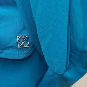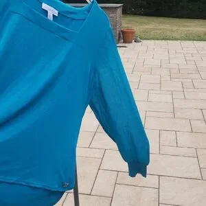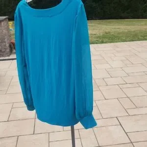 Elegant teal blouse by Calvin Klein. Features a square neckline and long sleeves.