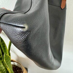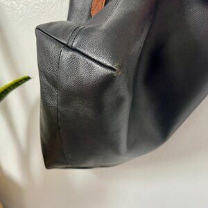 Large, open interior compartment with small zip pocket inside. Contrasting brown leather handles. In great used condition, some minor scuffs on bottom from use. 13.75"H x 14"W x 6.25"D.