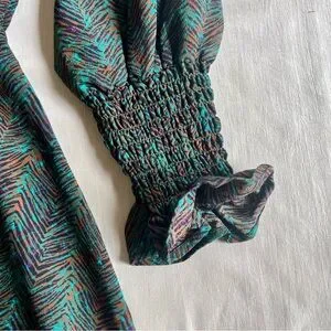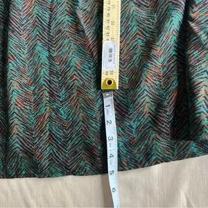 Stylish long sleeve dress with a vibrant zigzag pattern. Features a mix of green, black, and brown colors.