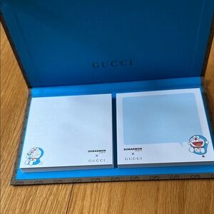 Enhance your office supplies with this Gucci notes book, showcasing a refined brown cover with vibrant blue accents. The design merges professionalism with a hint of playfulness, ideal for any work environment.