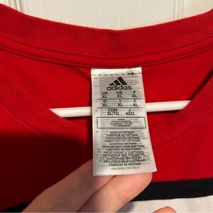 Bold red Adidas t-shirt with black and white logo design. Perfect for casual wear.