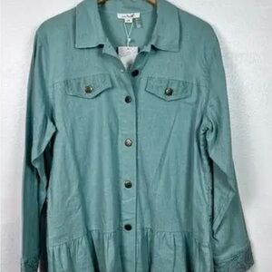 Simply Noelle Sea Green Women's Linen Jacket with Lace and ruffles.