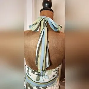Stylish halter top featuring a floral pattern. Accented with blue and green hues.