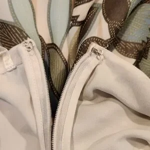 Halter tie neck; zip and hook closure.