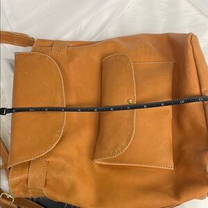 Gorgeous buckskin color. Stylish tan leather backpack. Features front pocket and flap closure. Perfect for everyday use.