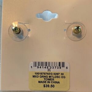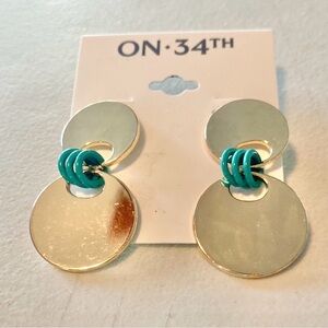 Elegant gold earrings with a pop of teal from . Perfect for adding a touch of color to any outfit. ON 34th, Gold and Green Two-Tiered Earrings with Geometric Design, NWT.