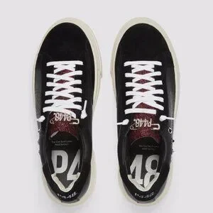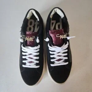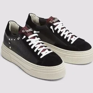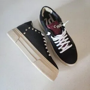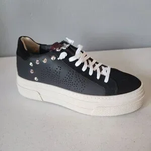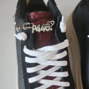"NEW" Super Cute Black Leather & Suede Platform Sneakers By P448. Lace Up Style, Maroon Padded Tongue with Logo Charm, Studded Side Accent, Removable Cushioned Insole/Foot Bed, 2" Rubber Platform & Soles, Made in Italy, New, Never Worn, Only Tried on:) Rt.325.00 approx. Size 41/10, Foot Bed Measures 10.3/4" for Reference. ** Sold Out Style.
