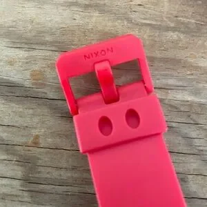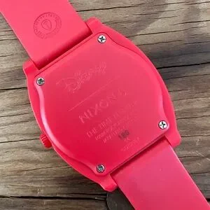 Nixon x Disney Mickey Mouse watch with Mickey Mouse minute and hour hands and star second hand. Red band and casing with black face and fighting Mickey on plastic cover. In great preowned condition, but needs new battery.