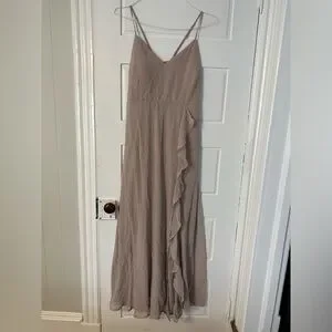 This elegant beige dress features a flattering silhouette with a stylish ruffle detail. Perfect for any occasion, it offers both comfort and sophistication. Only worn once