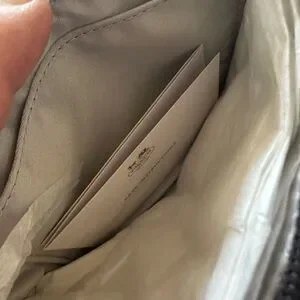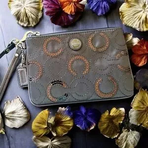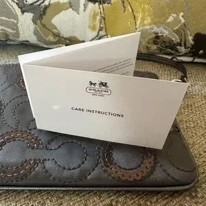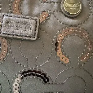 Elegant Coach wristlet or clutch in a stylish gray and golden brown sequin design that pair perfectly with browns, creams, neutrals and of course grays. The interior still has its original wrapping and care card. It’s immaculate and looks new but I con’t have its tags.