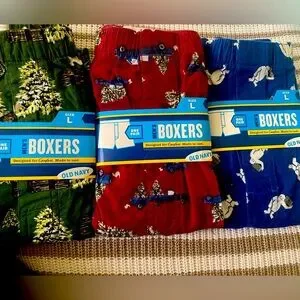 Set of three Old Navy men's boxers in green, red, and blue. Comfortable and stylish.