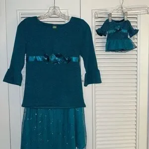 Super cute fancy and sparkly two piece teal outfit with matching 18 inch doll dress. Purchased for my daughter (a few years ago) for the holidays, but it wasn’t her vibe ☺️ - never worn/new without tags. It would be great for a fancy occasion or for playing dress up!