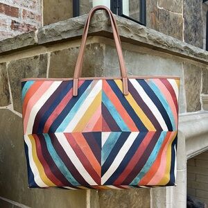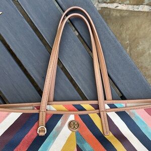 Tory Burch Multicolor Chevron Tote Bag. Featuring a vibrant chevron pattern in shades of blue, orange, pink, and tan, this bag is perfect for adding a pop of color to any outfit. Crafted with attention to detail, it's both stylish and functional.