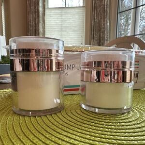 ⭐️NIB⭐️ Set of 2 airless pump jars. White with rose gold colored accents. 1–30 ml jar and 1–15 ml jar. 3 silicone spatulas included. Perfect for storing liquids for the gym or travel.