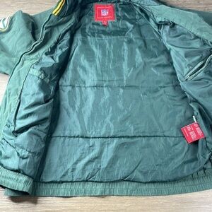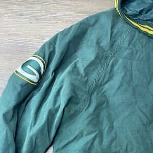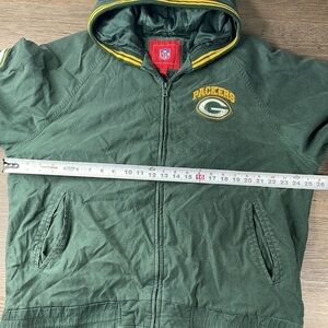 NFL Vintage Mens Green Bay Packers Hooded Zip Up Jacket, size large. In good used condition, but elastic is shot on cuffs and waistband. See pictures for measurements and fabric content.