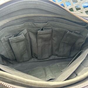 The leather on this bag is what I would call perfectly worn in. It’s not stiff as new but has a nice, weathered look and soft feel with no cracking or undue wear. This has three sleeve dividers inside and an array of pockets.