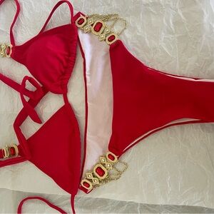 Turn heads with the Red Halter Bikini Set. This stunning swimsuit features a vibrant red color and elegant crystal detailing. Perfect for making a statement at the beach or pool.