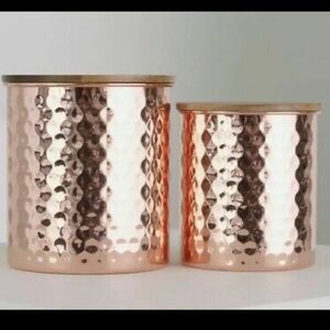 These brand new Uncommon James copper accent canisters feature a striking hammered texture that adds depth and character to any space. The warm, rosy copper tone and smooth wood lids create a sophisticated look, perfect for enhancing your home decor. Set includes two canisters, 45 oz capacity and 25 oz capacity.