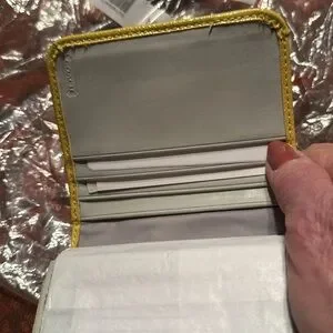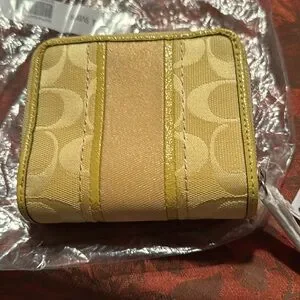 Stylish wallet in yellow and cream. Features a textured design. This wallet has never been used. The tags are on it. Snap closure. Has zippered compartment. Wallet has an ID window plus 9 slots for credit cards. Wallet is lovely