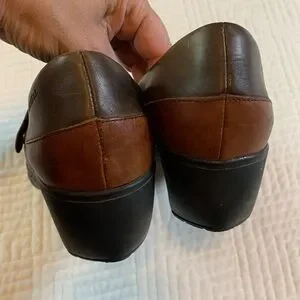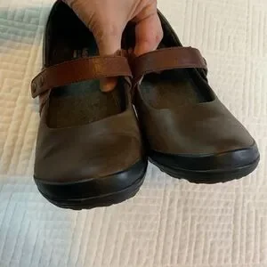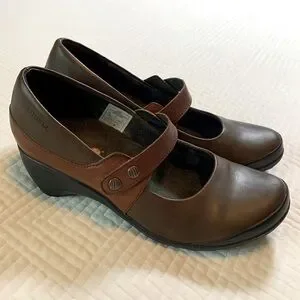 Merrell Veranda Emme J69042 Two Tone Brown Leather Mary Jane Shoes, Womens 8.5. Two snap options for leather strap. Brass tone hardware. Approximate 2” heel. Embossed Merrell brand logo on leather. Black slip resistant sole. Excellent pre-owned condition. Please see photos for further details and measurements.