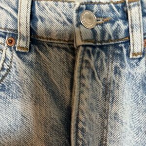 Modern distressed denim skirt with a frayed hem. Perfect for casual outings.