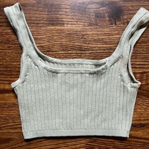 Aritzia Wilfred Stylish ribbed knit crop top in sage green. Perfect for layering or wearing alone.