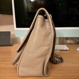 100% authentic - I originally purchased this bag from Fashionphile. All stock photos are from the original Fashionphile listing of the same bag. Condition shows some wear but overall good. The bag style is slouchy so it doesn’t stand up perfectly straight but it looks nice and relaxed on the shoulder as expected. There are some visible signs of wear on the leather covered YSL hardware, but nothing too drastic.