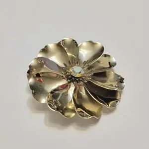 Vintage gold-tone flower brooch. Not sure what the flower is made of. Brooch is lightweight and has center prongs with a faceted glass center stone. Straight back pin with foldover clasp. Brooch is 2 3/8" wide. Excellent vintage condition. Belonged to my grandmother and it dord not appear as if she wore it.