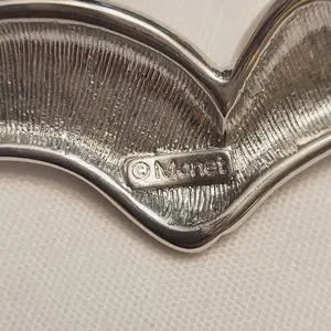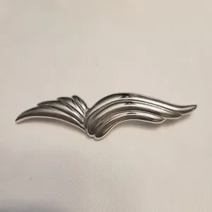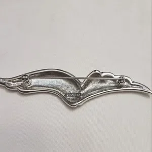 Silver-tone abstract brooch by Monet. Curved sleek lines that measure 3" long x 1/2" wide. Could be wings abstract seagull? Straight back pin with foldover clasp. Marked Monet. Very good pre-loved condition.