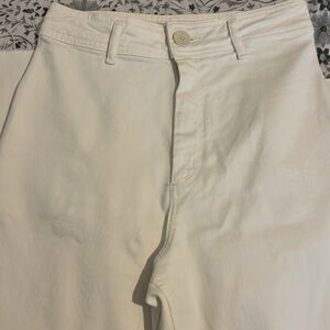 Chic high waist wide-leg jeans in a classic white color with button and zipper closure. Perfect for any occasion.