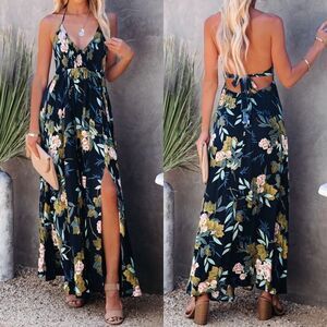 Navy blue floral backless maxi dress vacation smocked halter Easter