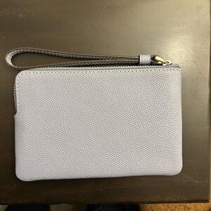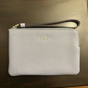 Elegant Coach wristlet in light blue. Features a sleek design with a convenient strap. Has two slots to hold cards.
