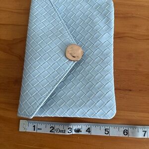 Elegant woven clutch in light blue. Features a stylish button closure.