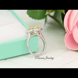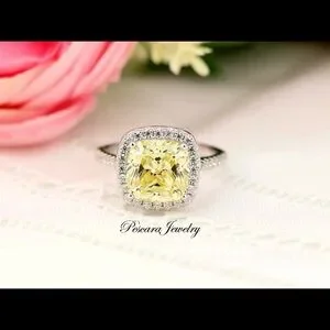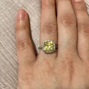3 carat canary yellow cushion halo ring - purchased on Etsy, they are made to order. In perfect condition, super sparkly. Would make a perfect engagement/ travel ring or cocktail ring.