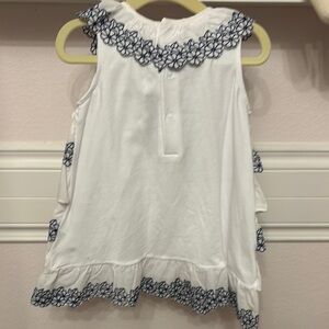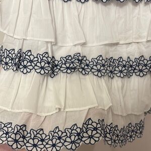Charming white dress featuring navy floral trim. Perfect for any occasion.Tiered embroidered navy blue floral ruffles on the front and hem layered over soft cotton jersey dress. NWT