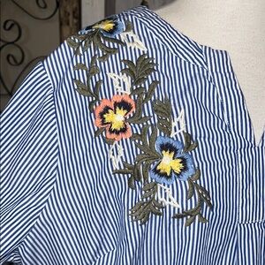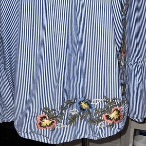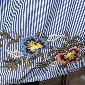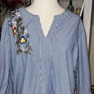 This Caslon blouse features a relaxed fit with striking bell sleeves and a mandarin collar, adorned with a graphic floral embroidery that adds a touch of elegance. The blue and white striped pattern provides a classic backdrop, while the colorful embellishments bring a vibrant flair to the design. Perfect for a casual yet sophisticated look, this top is a versatile addition to any wardrobe.
