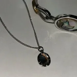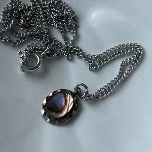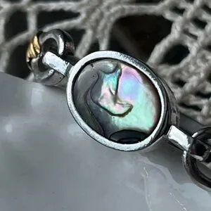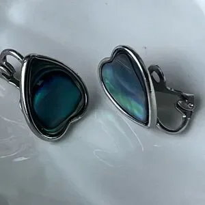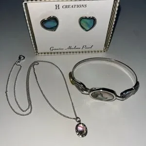 The vintage jewelry set includes earrings, a necklace, and a bracelet with abalone pearl accents. The brand options are Avon and H Creatons, with a vintage style. Bracelet measures