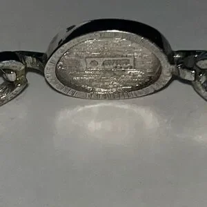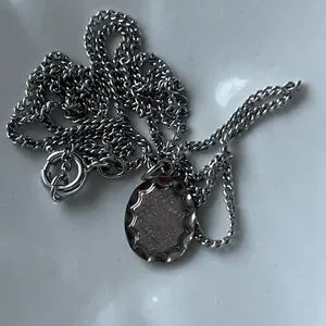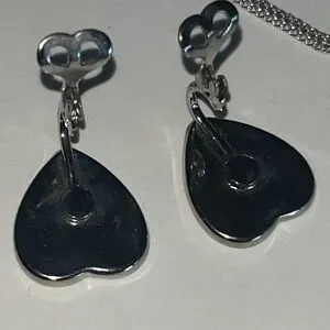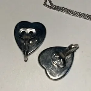 2 3/8 “ by 1 3/4 “and has a missing decorative gold finished piece on one side, as shown in photos. The heart earrings measure 5/8 “ by 3/4 “. Pendant measures 3/8” by 1/2 “ with an 18” chain.