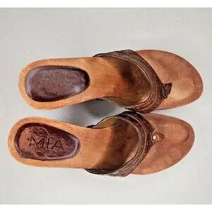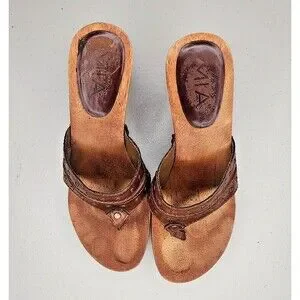 Elevate your summer footwear game with these vintage MIA leather sandals. The slip-on style features a strappy design with a mid-height block heel and wooden outsole. Perfect for a 90s-themed event or a casual day out, these brown slides are a must-have for any fashion-savvy woman. The insole is made of wood, making them unique and different from traditional sandals. These sandals are in excellent used condition and come in a size 7.