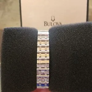 Elegant Bulova watch with a silver band. Stainless steel. Comes in original box. Perfect for any occasion. Used but good condition see photos.