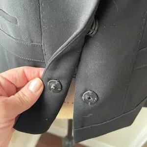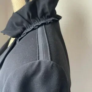 The collar makes a statement! As does the ribbon-like piping at shoulders and waist. Hidden snap button closures. Good used condition.